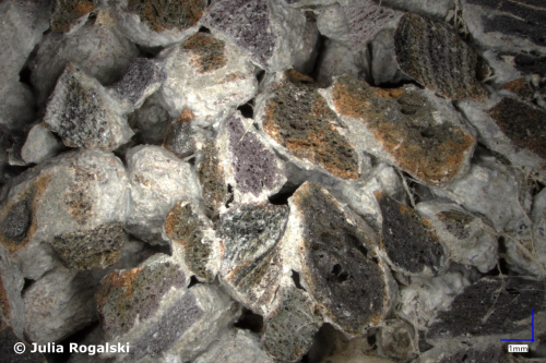 The image is taken from Julia Rogalski's bachelor thesis on “Experimental investigations into material degradation and microstructure of aggregate-porous lightweight concretes and their raw materials” at the Chair Construction Materials, in which experimental investigations into the frost-deicing salt resistance of aggregate-porous lightweight concretes were carried out. The image shows the microstructure of a lightweight aggregate concrete with expanded shale, photographed using a light microscope at 20x magnification.