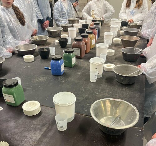 Im Betonlabor lernten die Teilnehmerinnen zunächst, aus welchen Bestandteilen sich Beton eigentlich zusammensetzt. Mit diesem Wissen stellten sie selbst einen Frischbeton im Betonmischer her. Sie konnten den Frischbeton mit eigenen Händen begreifen und stellten fest, dass er sich „gleichzeitig matschig und bröckelig“ anfühlt, als ob man „in Frikadellenteig Steine reinwirft“. Die tatsächliche Konsistenz wurde mithilfe eines Ausbreitversuches festgestellt. Dieser ergab eine Ausbreitmaßklasse von F2 (plastisch), was für eine Verarbeitung noch zu steif war. Die Schülerinnen erfuhren, dass nicht Wasser, sondern das Zusatzmittel Fließmittel die Konsistenz regulieren sollte. Nach der Fließmittelzugabe wurde der Beton weich (F3) und das Betonieren konnte starten. Jeder durfte ein eigenes Andenken mit bunt eingefärbtem Beton und Verzierungen für zu Hause erstellen. Tiefrote Herzen und bunte Kugeln waren das Ergebnis des ersten Workshop-Teiles.