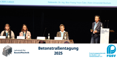 The Chair of Building Materials Technology was represented by a lecture by M.Sc. Julia Neumann entitled "Thin Concrete Overlays with Carbon Reinforcement for Jointed Plain Concrete Pavements as Alternative Joint Sealing" and by M.Sc. David Ov with the title "Reliable Test Procedure for the Characterization of Joint Sealants in Concrete Pavements".